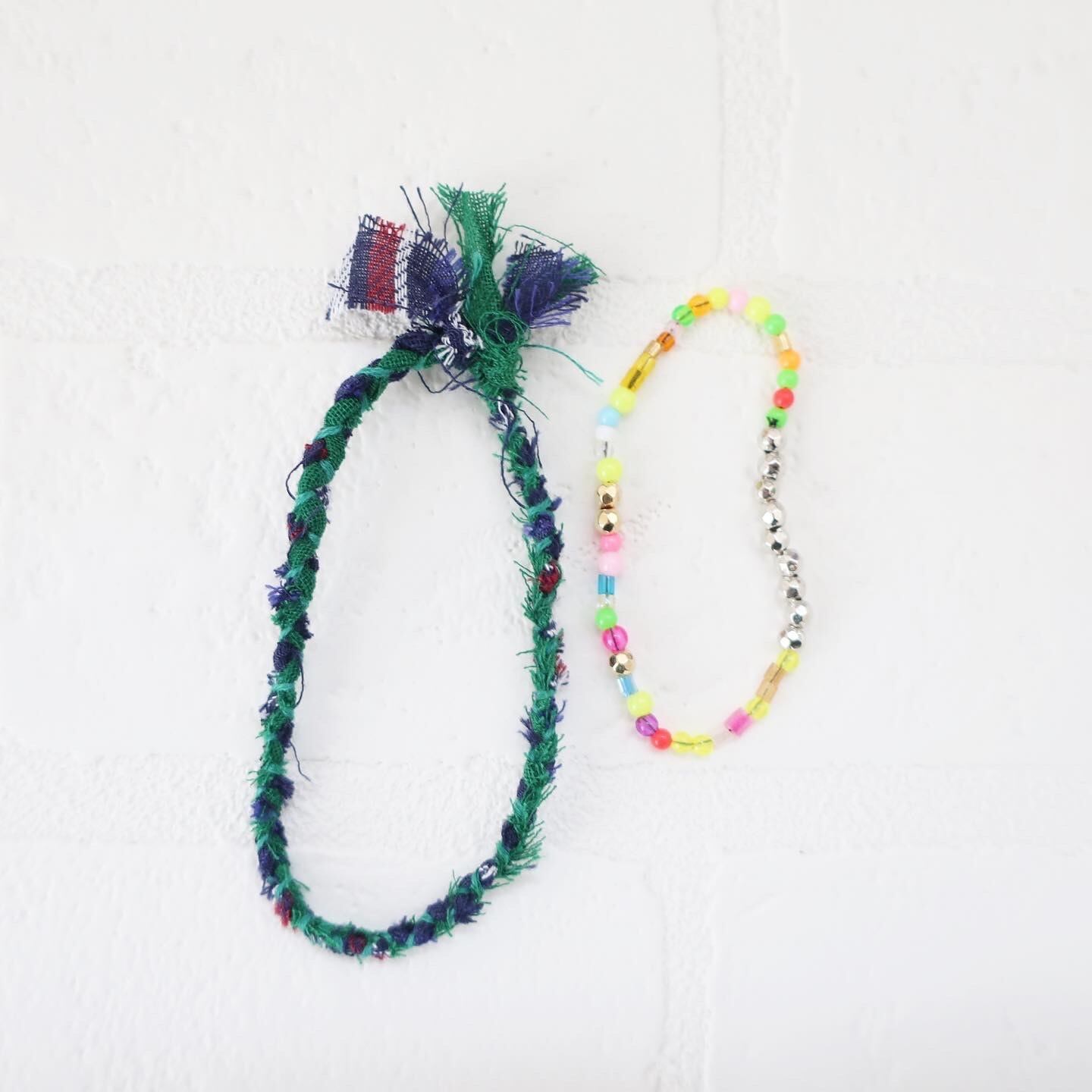 ジャケット生地を編み込んだ布製ネックレスと、ビーズネックレスの2個セットです。